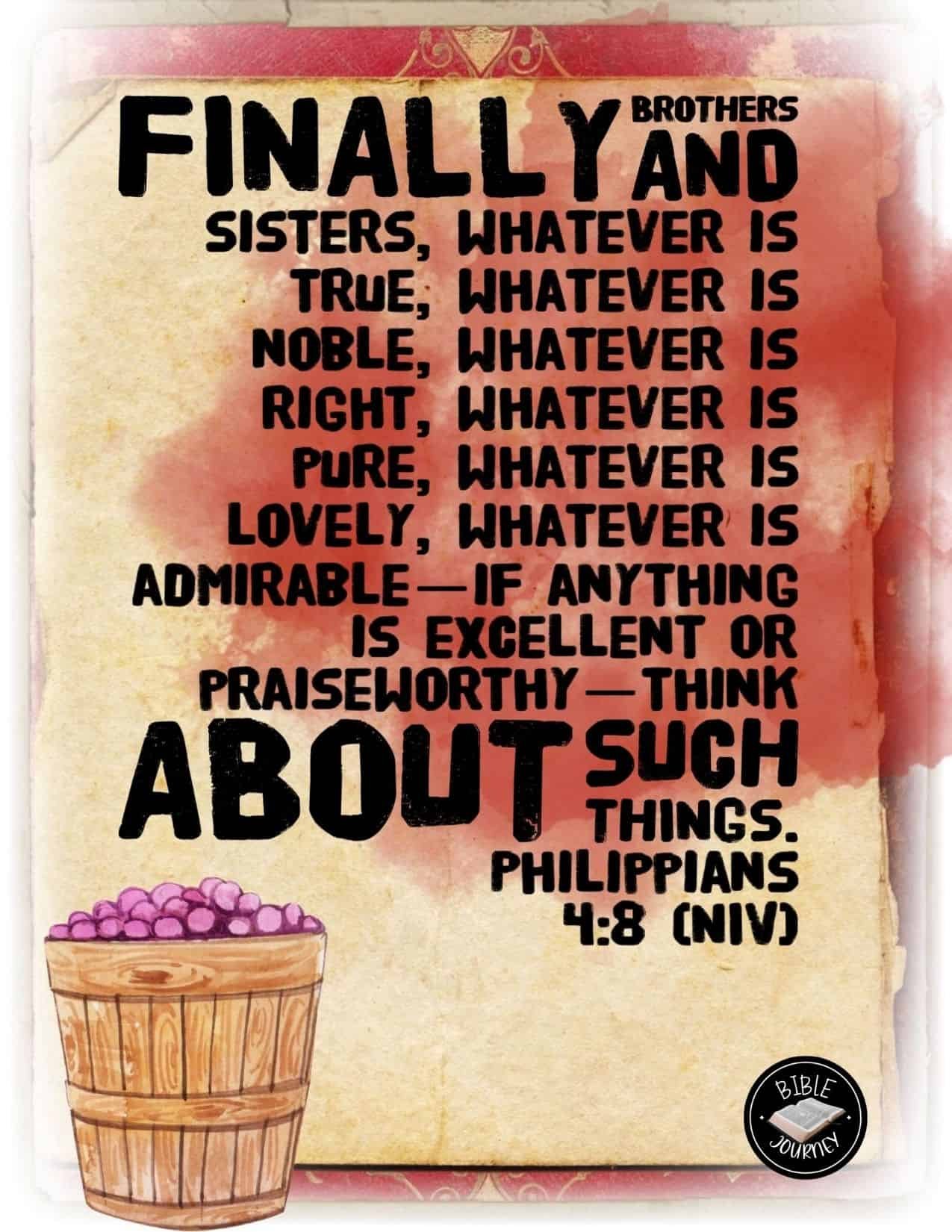 Philippians 4:8 NIV Finally, brothers and sisters, whatever is true, whatever is noble, whatever is right, whatever is pure, whatever is lovely, whatever is admirable–if anything is excellent or praiseworthy–think about such things. Philippians 4:8 Commentaries Read Full Chapter Philippians 4 Philippians 4:8 KJV Finally, brethren, whatsoever things are true, whatsoever things are honest, whatsoever things are just, whatsoever things are pure, whatsoever things are lovely, whatsoever things are of good report; if there be any virtue, and if there be any praise, think on these things. Philippians 4:8 NLT And now, dear brothers and sisters, one final thing. Fix your thoughts on what is true, and honorable, and right, and pure, and lovely, and admirable. Think about things that are excellent and worthy of praise. Philippians 4:8 ESV Finally, brothers, whatever is true, whatever is honorable, whatever is just, whatever is pure, whatever is lovely, whatever is commendable, if there is any excellence, if there is anything worthy of praise, think about these things. Â Don’t Miss the Daily Word and Hundreds of Random Bible Verses Random Bible Quotes for Sharing and Journaling Explore Hundreds of Random Bible Verse Images for Study and Reflection Looking for More Inspiration? Â See our New Bible Printables. Printable 8×10 Scripture Wall Art Christian Stationery Christian Stationery – Matching Set With Bible Verses You May Enjoy Bible Verse Images About: The Power of Prayer Perseverance Bible Verses About Healing Inspirational Bible Verses God’s Promises Bible Verses About Anxiety Truth of God’s Word Love Bible Verses Comforting Bible Verses Bible Verses About Grace Encouragement Bible Verses About Suffering Bible Verses About Hope Bible Verses Blessings The Holy Spirit Trust Bible Verses